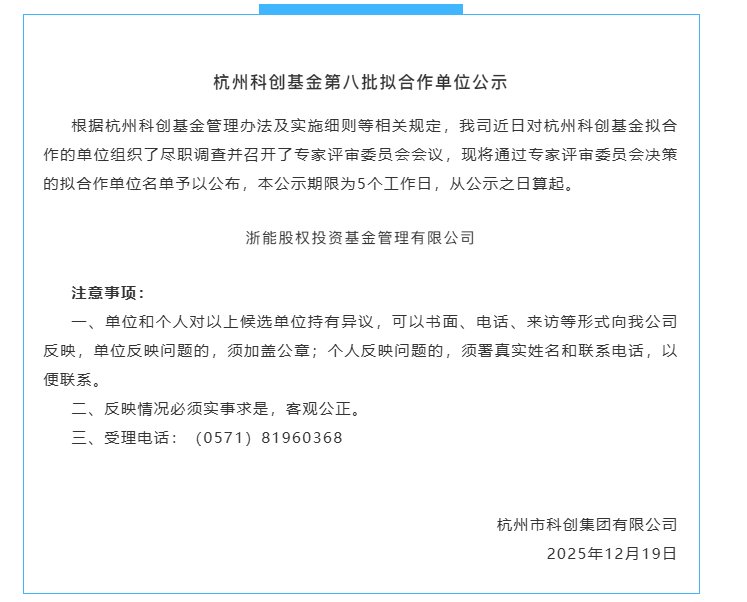 12月19日消息,杭州市科创集团有限公司发布公告,公示了杭州科创基金第八批拟合作单位,本次公示拟合作单位是:浙能股权投资基金管理有限公司。