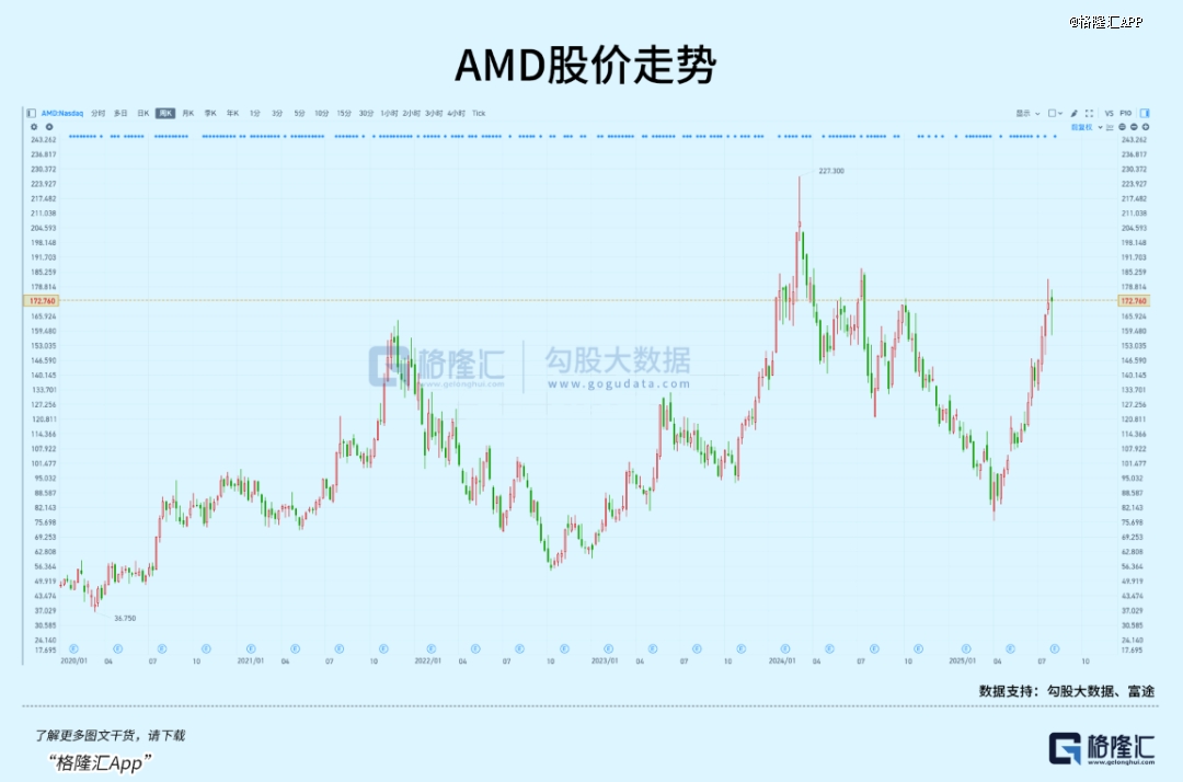 今年AMD股价从四月初76.48美元的低点反弹至170美元以上的高位,涨幅超过一倍。