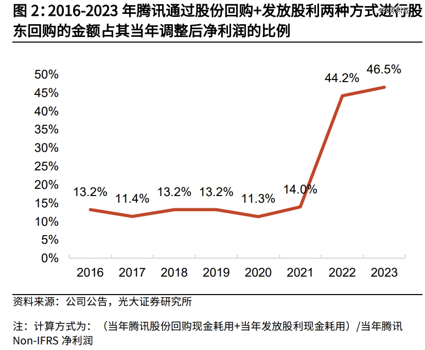 但2022年之后,面对大股东PROSUS公司的清仓式减持,腾讯开启了回购对冲模式。梳理回购历史,腾讯的密集回购行为是从2021年开始的。2021年腾讯全年回购25.99亿港元,之后其每年保持密集回购,且规模逐年增长,去年回购规模更是达到1120亿港元,今年的回购目标则为800亿港元。