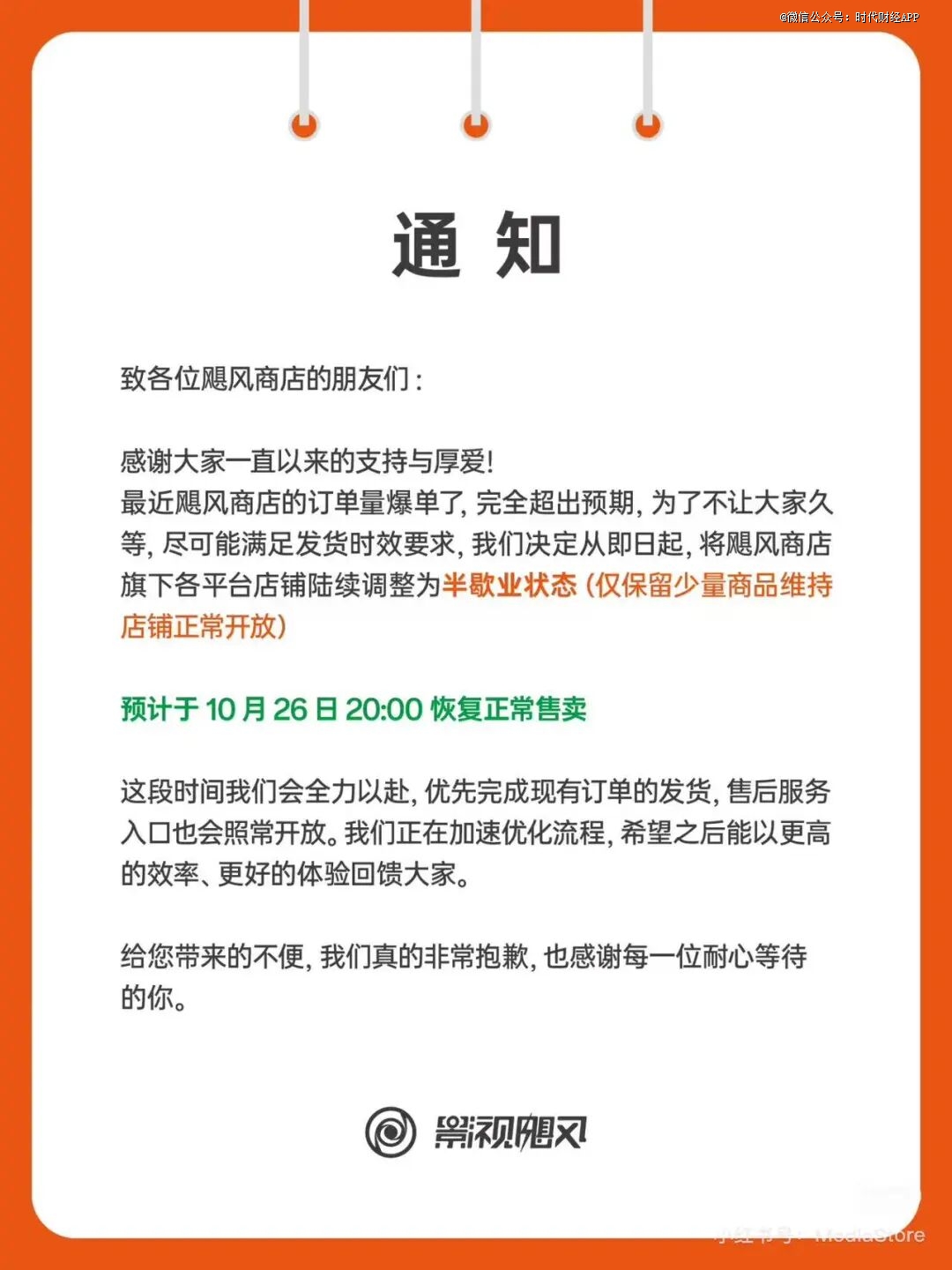 10月22日,影视飓风MediaStore在小红书、抖音等平台发文称,“由于旗下服饰品牌STORMCREW的订单量完全超过预期,将各平台店铺陆续调整为半歇业状态,预计于10月26日恢复正常售卖。”