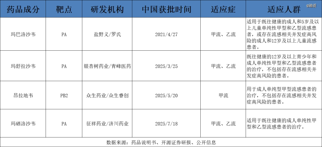 青峰医药的玛舒拉沙韦片、众生药业的昂拉地韦片、济川药业的玛硒洛沙韦片相继获批,成为首批上市的国产创新抗流感药。同时,健康元的玛帕西沙韦、先声药业的玛氘诺沙韦亦已提交新药上市申请,距离正式获批仅一步之遥。