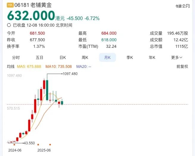 这期间,老铺黄金还曾于今年9月30日触顶过1097.48港元/股,市值一度飙升至1937亿港元。